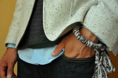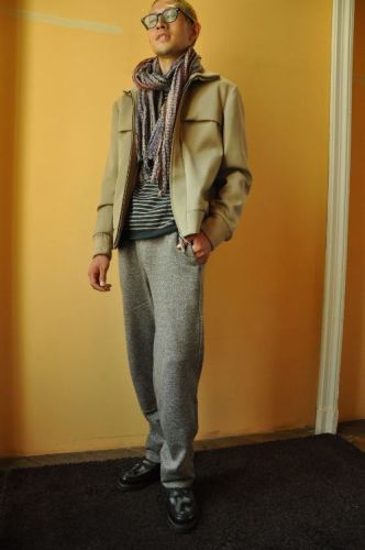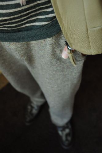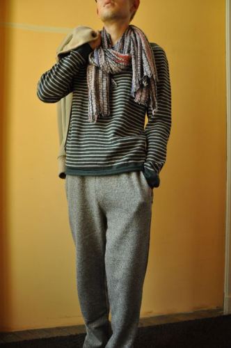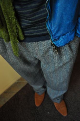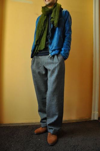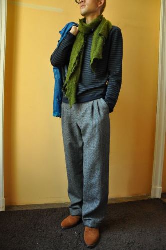 それにはドレス感が必要であり、ウールの織りストライプの太めスラックスや