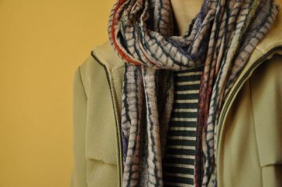 全体的に柔らかい印象となりますが、そこにボーダーVSストールの格子柄でアクセント付け。